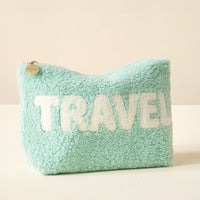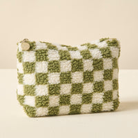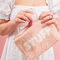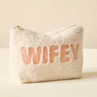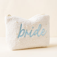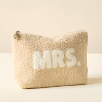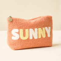 Add a cozy touch to your essentials with our Howdy Howdy Howdy teddy pouch. Crafted from soft sherpa fabric, this pouch features a wipeable lining for easy cleaning, and gold zippers and hardware for a polished look. The interior is lined with a fun printed fabric, making it as stylish on the inside as it is on the outside. A perfect size for keeping your favorite items organized, and can be beautifully paired with our other teddy pouch sizes to create a matching set.