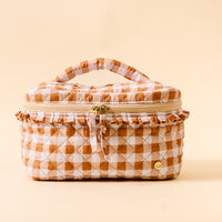 Simplify your routine with our Glam & Go Quilted Cosmetic Bag. Crafted from soft, quilted fabric with a sturdy handle, this bag features an all-around gold double zipper for easy access. Inside, the signature darling wipeable interior lining keeps everything neat and organized. It's perfectly sized to carry your must-haves, whether you're traveling, running errands, or just need a stylish way to keep your essentials in place.